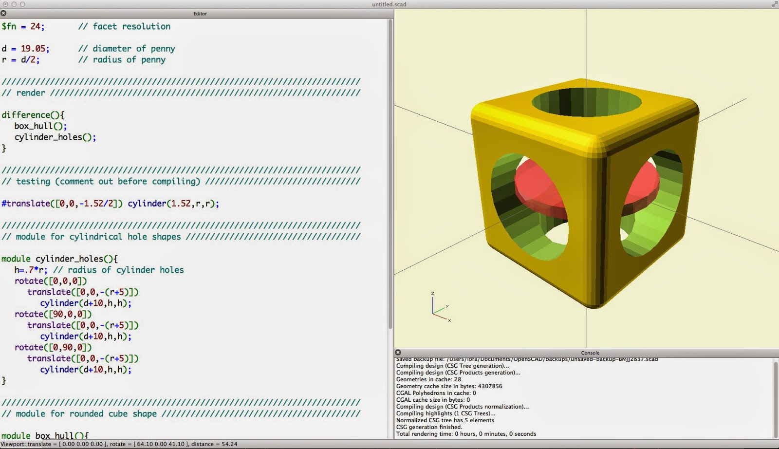 The module cylinder_holes below makes four cylinders, each with radius equal to 70% of the radius of the coin, so that the coin cannot fall out of the holes. We made the cylinders a little longer than the box so that they would cut out clean holes. OpenSCAD does not like it when two objects share the same faces, so we we are making the cylinders longer so as to not have faces that coincide with the faces of the rounded cube object. Each cylinder is translated to be centered and then rotated so that the three cylinders lie in mutually perpendicular directions. The “#” in front of the cylinders is only for this demo; it makes the cylinders red so that we can see them even after they are removed. Finally, in the “render” section we use difference to remove the cylinders from the rounded cube.